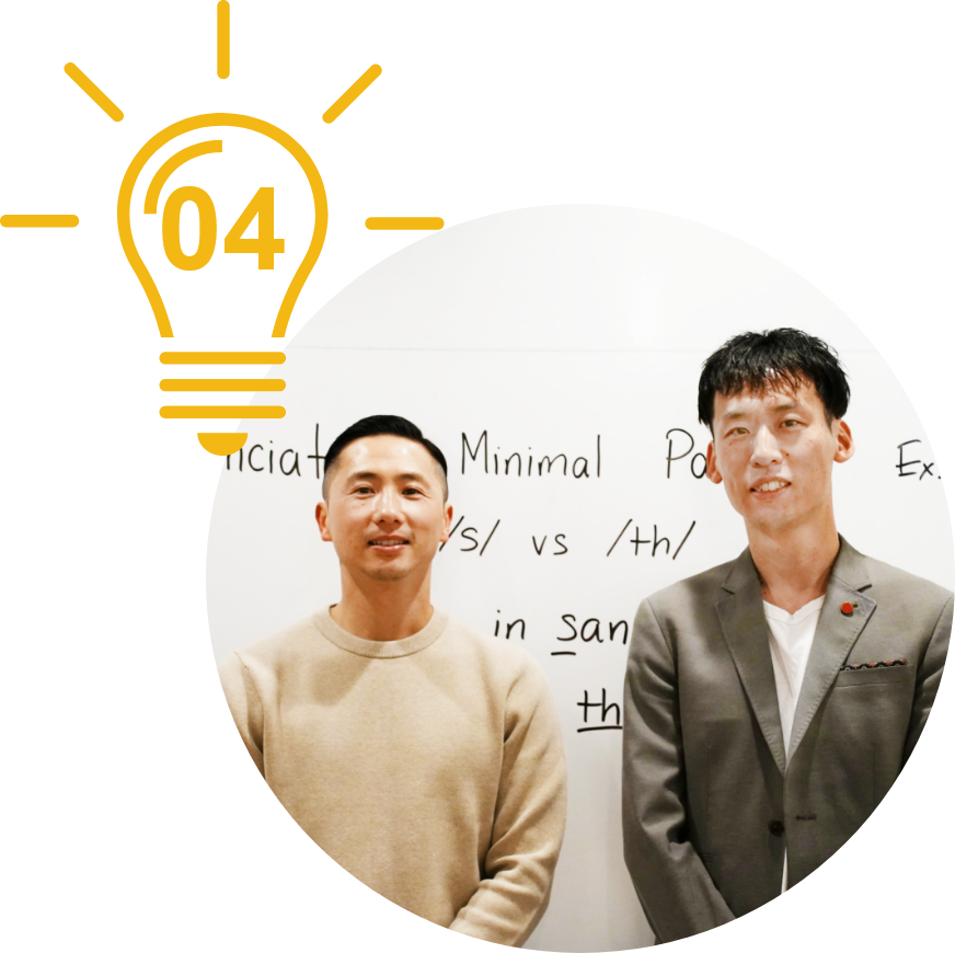 専属の日本人コーチ、ネイティブコーチが二人三脚で文法からネイティブの英語発音を発声法までサポートいたします。